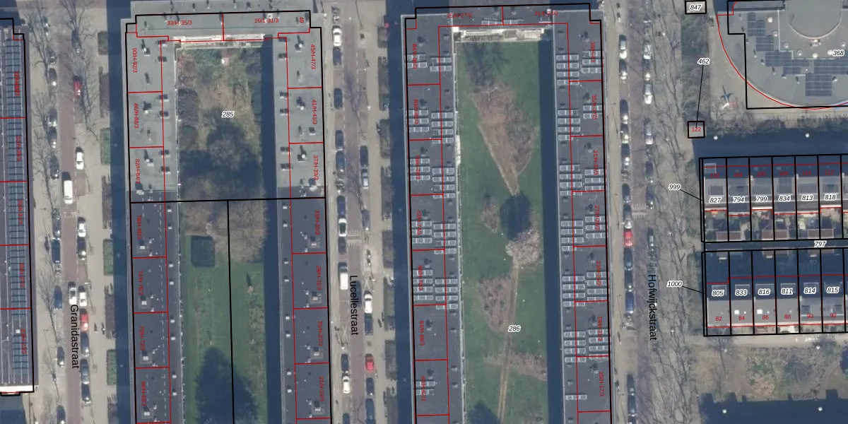 Het perceel waarop Lucellestraat 74-1 staat heeft een oppervlakte van 6516 m². Dit is een zeer groot perceel. De perceeloppervlakte wordt geregistreerd door het Kadaster. Gedetailleerde informatie over de maten van dit perceel kunt u vinden in het rapport Kadastrale kaart met maatvoering van Lucellestraat 74-1.