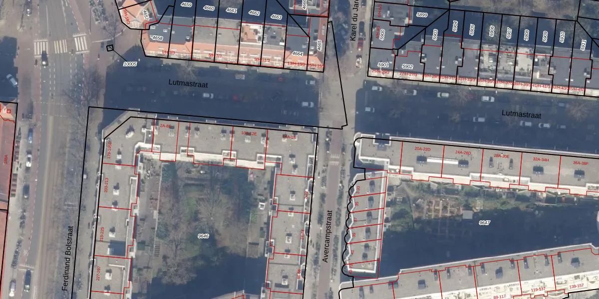 Lutmastraat 16-E is gelegen op kadastraal perceel ASD18V9646. Deze kadastrale aanduiding is uniek en wordt gebruikt door het Kadaster om eigendomsrechten en andere zakelijke rechten vast te leggen. Het perceel maakt onderdeel uit van de kadastrale gemeente Amsterdam.