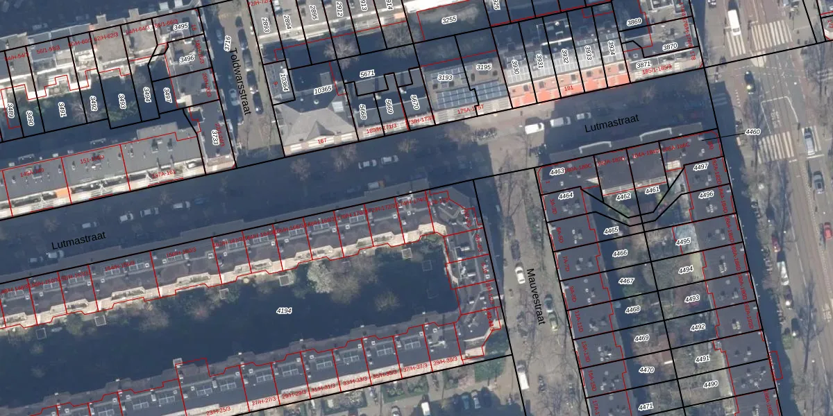Lutmastraat 174-1 is gelegen op kadastraal perceel ASD18V4194. Deze kadastrale aanduiding is uniek en wordt gebruikt door het Kadaster om eigendomsrechten en andere zakelijke rechten vast te leggen. Het perceel maakt onderdeel uit van de kadastrale gemeente Amsterdam.