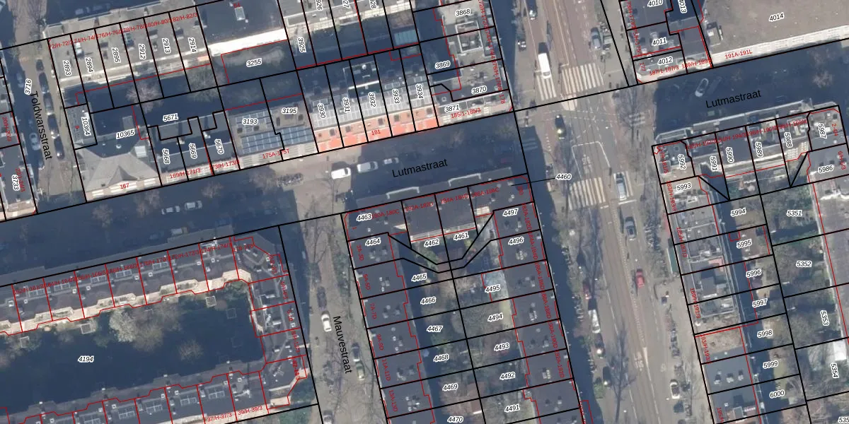 Lutmastraat 182-B is gelegen op kadastraal perceel ASD18V4462. Deze kadastrale aanduiding is uniek en wordt gebruikt door het Kadaster om eigendomsrechten en andere zakelijke rechten vast te leggen. Het perceel maakt onderdeel uit van de kadastrale gemeente Amsterdam.