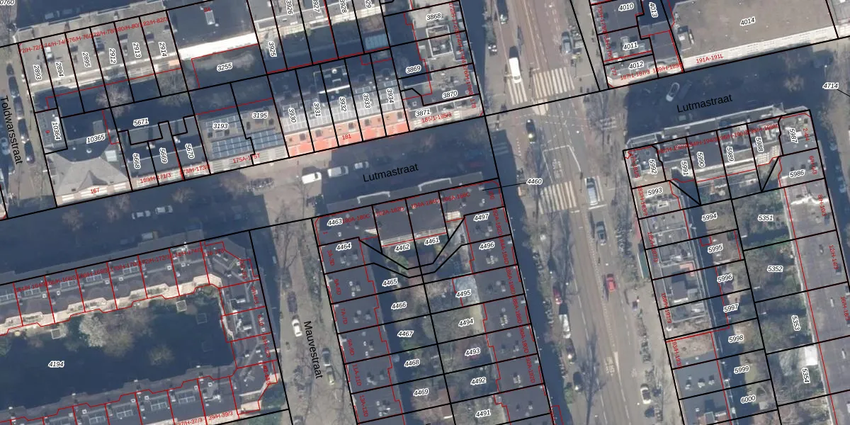 Lutmastraat 184-A is gelegen op kadastraal perceel ASD18V4461. Deze kadastrale aanduiding is uniek en wordt gebruikt door het Kadaster om eigendomsrechten en andere zakelijke rechten vast te leggen. Het perceel maakt onderdeel uit van de kadastrale gemeente Amsterdam.
