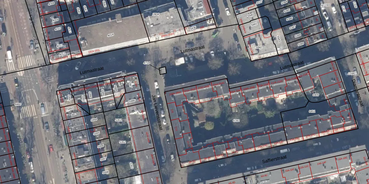 Het perceel waarop Lutmastraat 202-C staat heeft een oppervlakte van 2614 m². Dit is een zeer groot perceel. De perceeloppervlakte wordt geregistreerd door het Kadaster. Gedetailleerde informatie over de maten van dit perceel kunt u vinden in het rapport Kadastrale kaart met maatvoering van Lutmastraat 202-C.