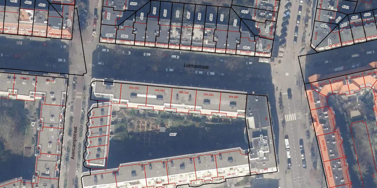 Lutmastraat 30-B is gelegen op kadastraal perceel ASD18V9647. Deze kadastrale aanduiding is uniek en wordt gebruikt door het Kadaster om eigendomsrechten en andere zakelijke rechten vast te leggen. Het perceel maakt onderdeel uit van de kadastrale gemeente Amsterdam.