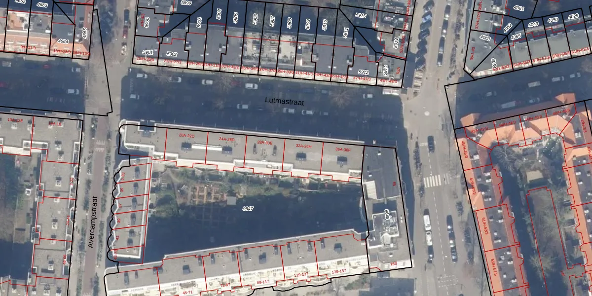 Lutmastraat 32-A is gelegen op kadastraal perceel ASD18V9647. Deze kadastrale aanduiding is uniek en wordt gebruikt door het Kadaster om eigendomsrechten en andere zakelijke rechten vast te leggen. Het perceel maakt onderdeel uit van de kadastrale gemeente Amsterdam.
