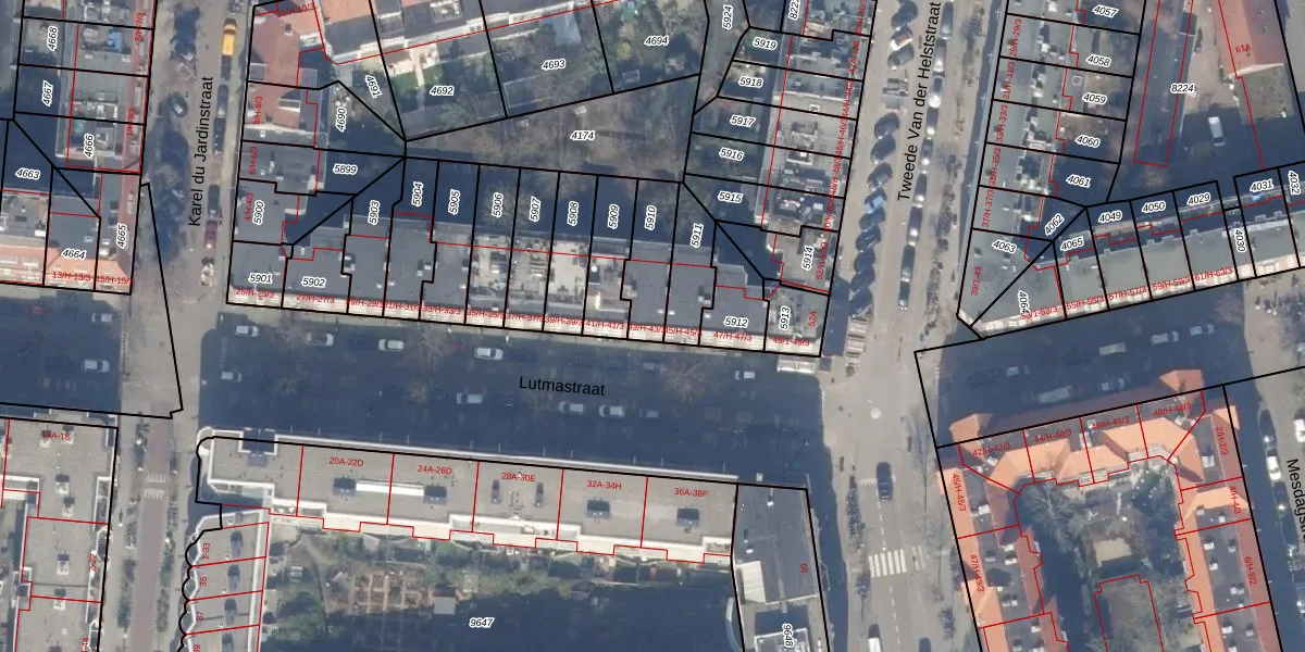 Lutmastraat 43-3 is gelegen op kadastraal perceel ASD18V5910. Deze kadastrale aanduiding is uniek en wordt gebruikt door het Kadaster om eigendomsrechten en andere zakelijke rechten vast te leggen. Het perceel maakt onderdeel uit van de kadastrale gemeente Amsterdam.