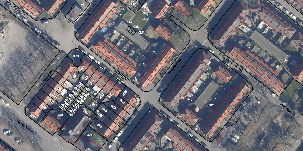 Het perceel waarop Maanstraat 15 staat heeft een oppervlakte van 4733 m². Dit is een zeer groot perceel. De perceeloppervlakte wordt geregistreerd door het Kadaster. Gedetailleerde informatie over de maten van dit perceel kunt u vinden in het rapport Kadastrale kaart met maatvoering van Maanstraat 15.