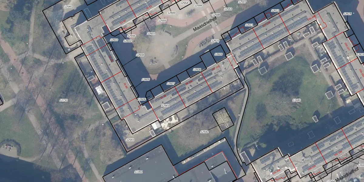 Het perceel waarop Maasdrielhof 102 staat heeft een oppervlakte van 7214 m². Dit is een zeer groot perceel. De perceeloppervlakte wordt geregistreerd door het Kadaster. Gedetailleerde informatie over de maten van dit perceel kunt u vinden in het rapport Kadastrale kaart met maatvoering van Maasdrielhof 102.