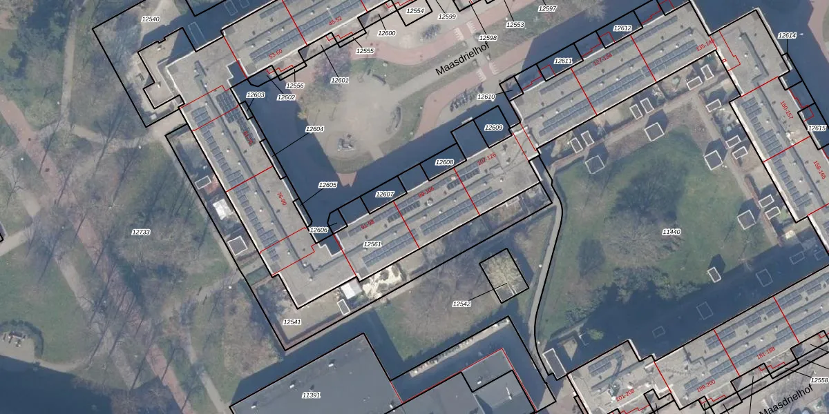 Het perceel waarop Maasdrielhof 103 staat heeft een oppervlakte van 7214 m². Dit is een zeer groot perceel. De perceeloppervlakte wordt geregistreerd door het Kadaster. Gedetailleerde informatie over de maten van dit perceel kunt u vinden in het rapport Kadastrale kaart met maatvoering van Maasdrielhof 103.