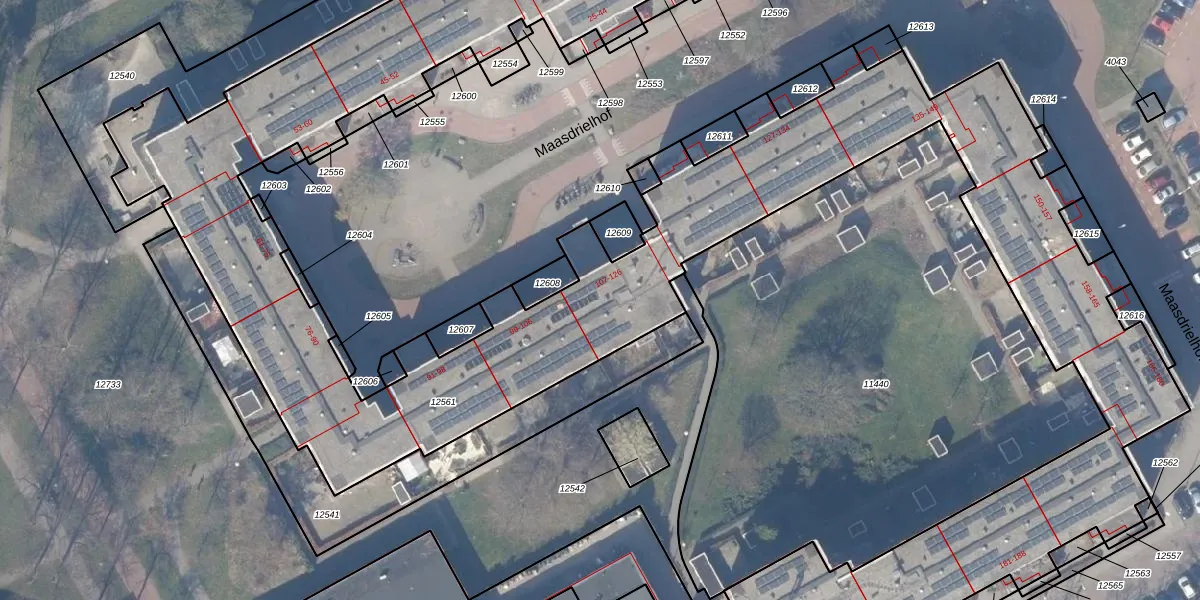 Het perceel waarop Maasdrielhof 114 staat heeft een oppervlakte van 7214 m². Dit is een zeer groot perceel. De perceeloppervlakte wordt geregistreerd door het Kadaster. Gedetailleerde informatie over de maten van dit perceel kunt u vinden in het rapport Kadastrale kaart met maatvoering van Maasdrielhof 114.