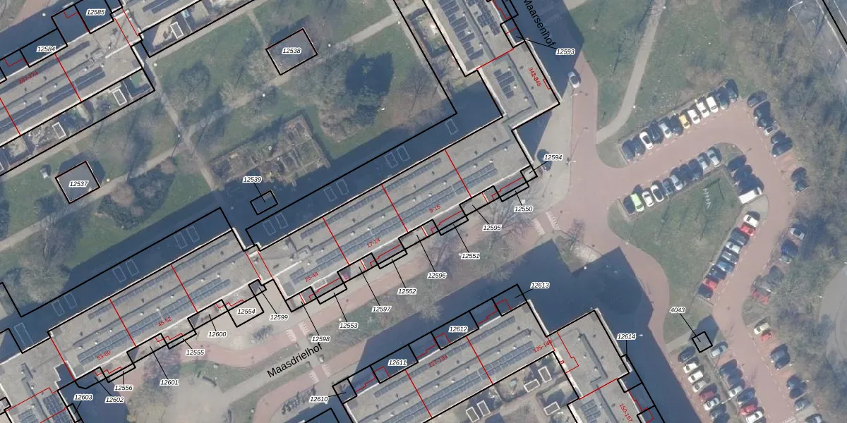 Het perceel waarop Maasdrielhof 14 staat heeft een oppervlakte van 7214 m². Dit is een zeer groot perceel. De perceeloppervlakte wordt geregistreerd door het Kadaster. Gedetailleerde informatie over de maten van dit perceel kunt u vinden in het rapport Kadastrale kaart met maatvoering van Maasdrielhof 14.