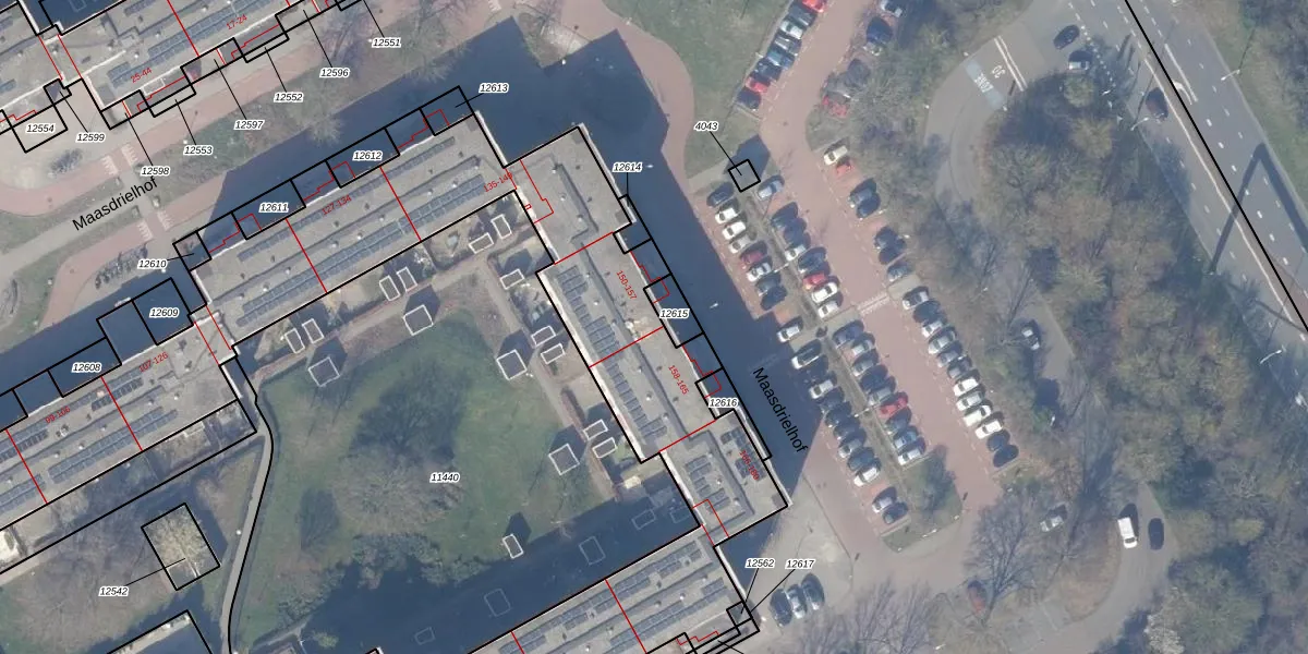Maasdrielhof 156 is gelegen op kadastraal perceel WPK02L12561. Deze kadastrale aanduiding is uniek en wordt gebruikt door het Kadaster om eigendomsrechten en andere zakelijke rechten vast te leggen. Het perceel maakt onderdeel uit van de kadastrale gemeente Weesperkarspel.