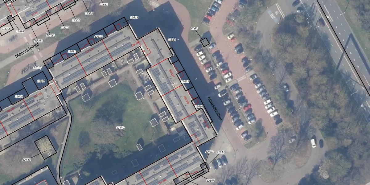 Het perceel waarop Maasdrielhof 159 staat heeft een oppervlakte van 7214 m². Dit is een zeer groot perceel. De perceeloppervlakte wordt geregistreerd door het Kadaster. Gedetailleerde informatie over de maten van dit perceel kunt u vinden in het rapport Kadastrale kaart met maatvoering van Maasdrielhof 159.