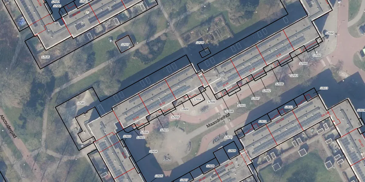Het perceel waarop Maasdrielhof 40 staat heeft een oppervlakte van 7214 m². Dit is een zeer groot perceel. De perceeloppervlakte wordt geregistreerd door het Kadaster. Gedetailleerde informatie over de maten van dit perceel kunt u vinden in het rapport Kadastrale kaart met maatvoering van Maasdrielhof 40.