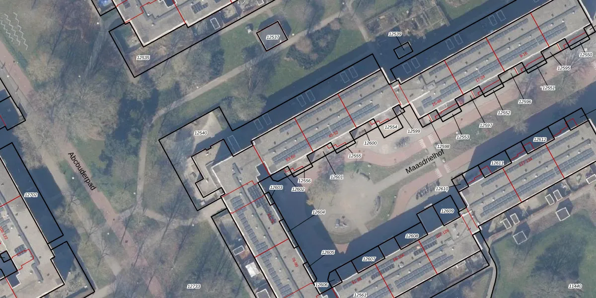 Het perceel waarop Maasdrielhof 53 staat heeft een oppervlakte van 7214 m². Dit is een zeer groot perceel. De perceeloppervlakte wordt geregistreerd door het Kadaster. Gedetailleerde informatie over de maten van dit perceel kunt u vinden in het rapport Kadastrale kaart met maatvoering van Maasdrielhof 53.