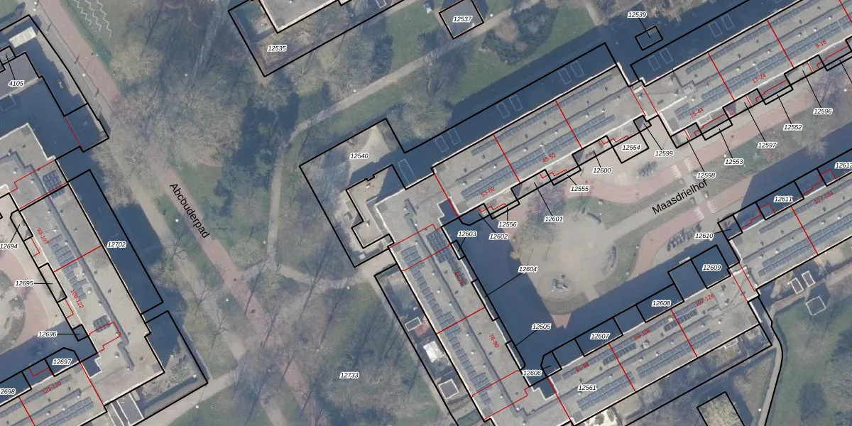 Het perceel waarop Maasdrielhof 63 staat heeft een oppervlakte van 7214 m². Dit is een zeer groot perceel. De perceeloppervlakte wordt geregistreerd door het Kadaster. Gedetailleerde informatie over de maten van dit perceel kunt u vinden in het rapport Kadastrale kaart met maatvoering van Maasdrielhof 63.