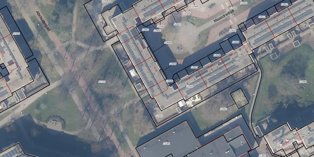 Het perceel waarop Maasdrielhof 83 staat heeft een oppervlakte van 7214 m². Dit is een zeer groot perceel. De perceeloppervlakte wordt geregistreerd door het Kadaster. Gedetailleerde informatie over de maten van dit perceel kunt u vinden in het rapport Kadastrale kaart met maatvoering van Maasdrielhof 83.