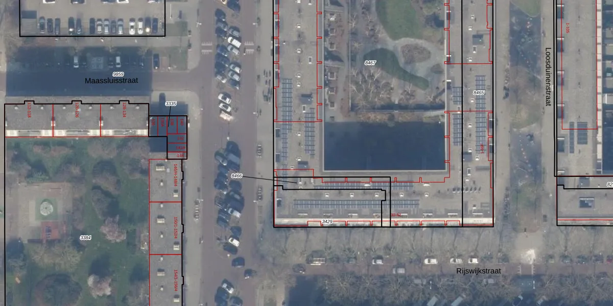 Het perceel waarop Maassluisstraat 65-B staat heeft een oppervlakte van 5457 m². Dit is een zeer groot perceel. De perceeloppervlakte wordt geregistreerd door het Kadaster. Gedetailleerde informatie over de maten van dit perceel kunt u vinden in het rapport Kadastrale kaart met maatvoering van Maassluisstraat 65-B.