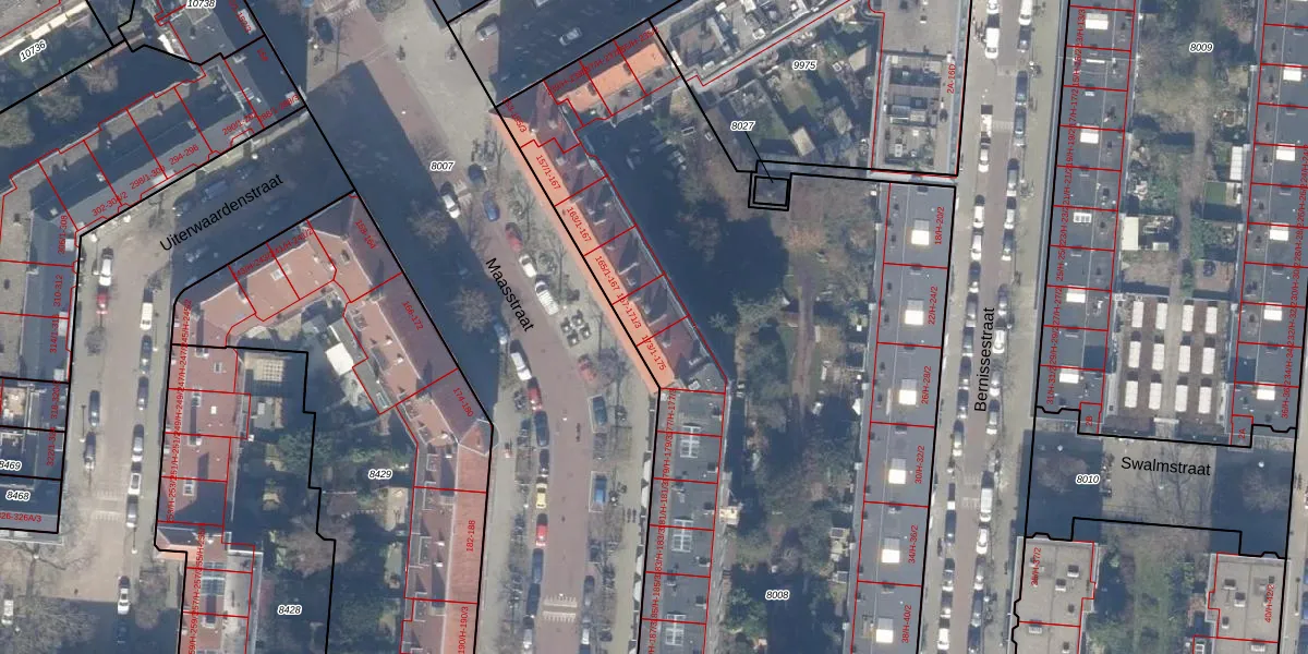 Maasstraat 171-2 is gelegen op kadastraal perceel ASD18V8008. Deze kadastrale aanduiding is uniek en wordt gebruikt door het Kadaster om eigendomsrechten en andere zakelijke rechten vast te leggen. Het perceel maakt onderdeel uit van de kadastrale gemeente Amsterdam.