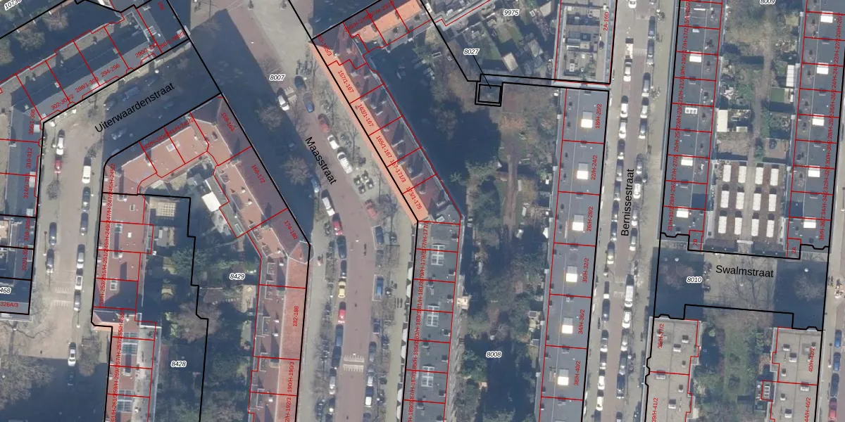 Maasstraat 175 is gelegen op kadastraal perceel ASD18V8008. Deze kadastrale aanduiding is uniek en wordt gebruikt door het Kadaster om eigendomsrechten en andere zakelijke rechten vast te leggen. Het perceel maakt onderdeel uit van de kadastrale gemeente Amsterdam.
