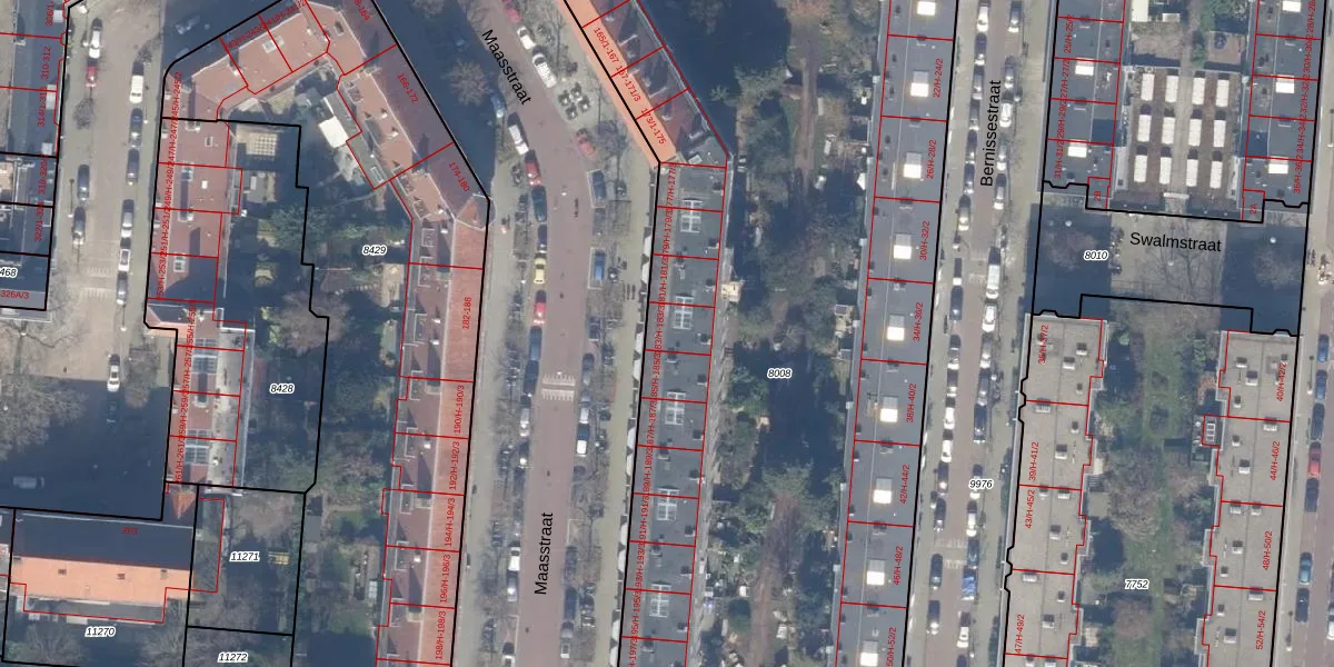 Maasstraat 183-H is gelegen op kadastraal perceel ASD18V8008. Deze kadastrale aanduiding is uniek en wordt gebruikt door het Kadaster om eigendomsrechten en andere zakelijke rechten vast te leggen. Het perceel maakt onderdeel uit van de kadastrale gemeente Amsterdam.