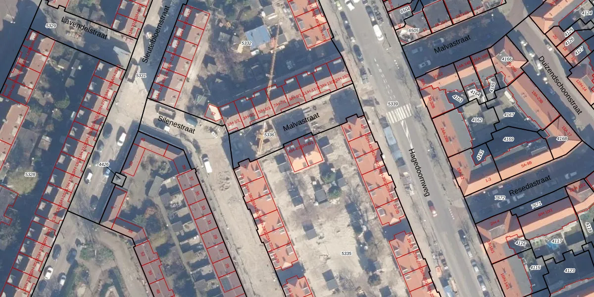 Het perceel waarop Malvastraat 4-H staat heeft een oppervlakte van 3844 m². Dit is een zeer groot perceel. De perceeloppervlakte wordt geregistreerd door het Kadaster. Gedetailleerde informatie over de maten van dit perceel kunt u vinden in het rapport Kadastrale kaart met maatvoering van Malvastraat 4-H.