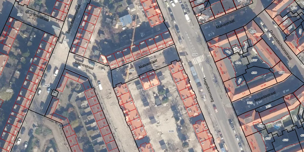 Het perceel waarop Malvastraat 6-H staat heeft een oppervlakte van 3844 m². Dit is een zeer groot perceel. De perceeloppervlakte wordt geregistreerd door het Kadaster. Gedetailleerde informatie over de maten van dit perceel kunt u vinden in het rapport Kadastrale kaart met maatvoering van Malvastraat 6-H.