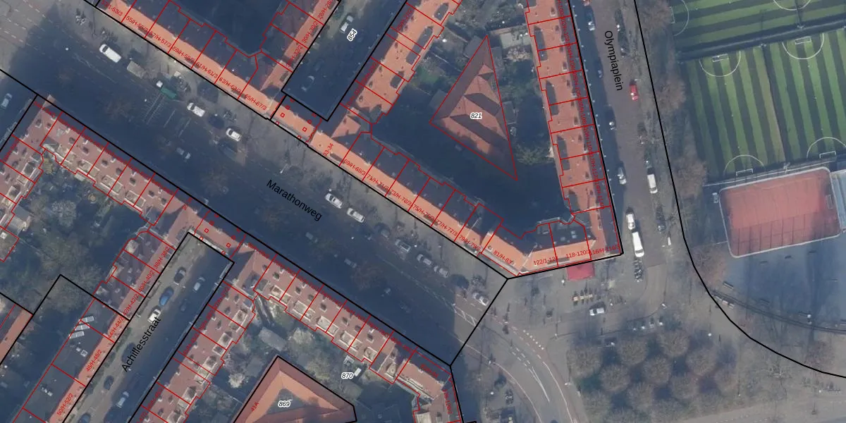 Het perceel waarop het adres ligt is ASD24-AC-821. De afkorting 'ASD24' staat voor kadastrale gemeente Amsterdam. Het perceel is met 3907 m² relatief groot. Het gemiddelde ligt in de kadastrale gemeente Amsterdam op 1361,91 m². De grootste perceeloppervlakte in de kadastrale gemeente is 5,8 ha. De kleinste oppervlakte bedraagt 1 m². Op het perceel zijn 113 adressen aanwezig. In de Basisregistratie Kadaster (BRK) werden de grenzen van het perceel geregistreerd op 28-11-1997.