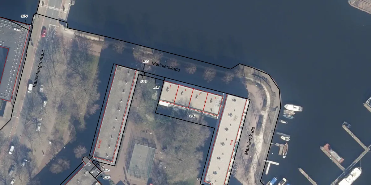 Het perceel waarop Marinierskade 2 staat heeft een oppervlakte van 3229 m². Dit is een zeer groot perceel. De perceeloppervlakte wordt geregistreerd door het Kadaster. Gedetailleerde informatie over de maten van dit perceel kunt u vinden in het rapport Kadastrale kaart met maatvoering van Marinierskade 2.