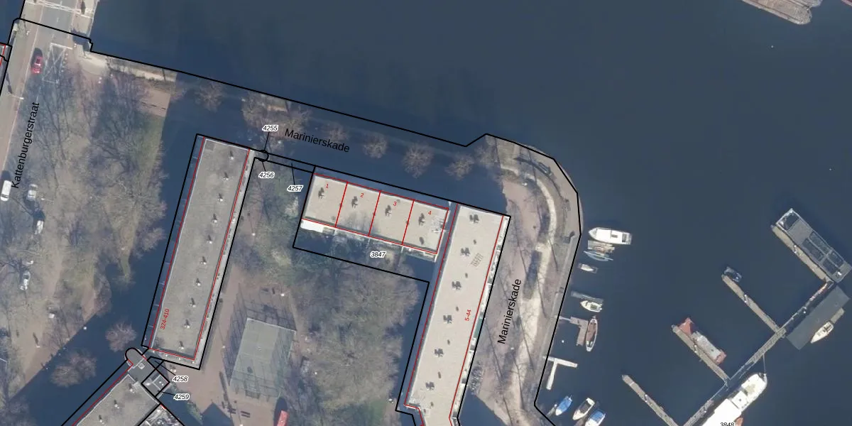 Het perceel waarop Marinierskade 4 staat heeft een oppervlakte van 3229 m². Dit is een zeer groot perceel. De perceeloppervlakte wordt geregistreerd door het Kadaster. Gedetailleerde informatie over de maten van dit perceel kunt u vinden in het rapport Kadastrale kaart met maatvoering van Marinierskade 4.