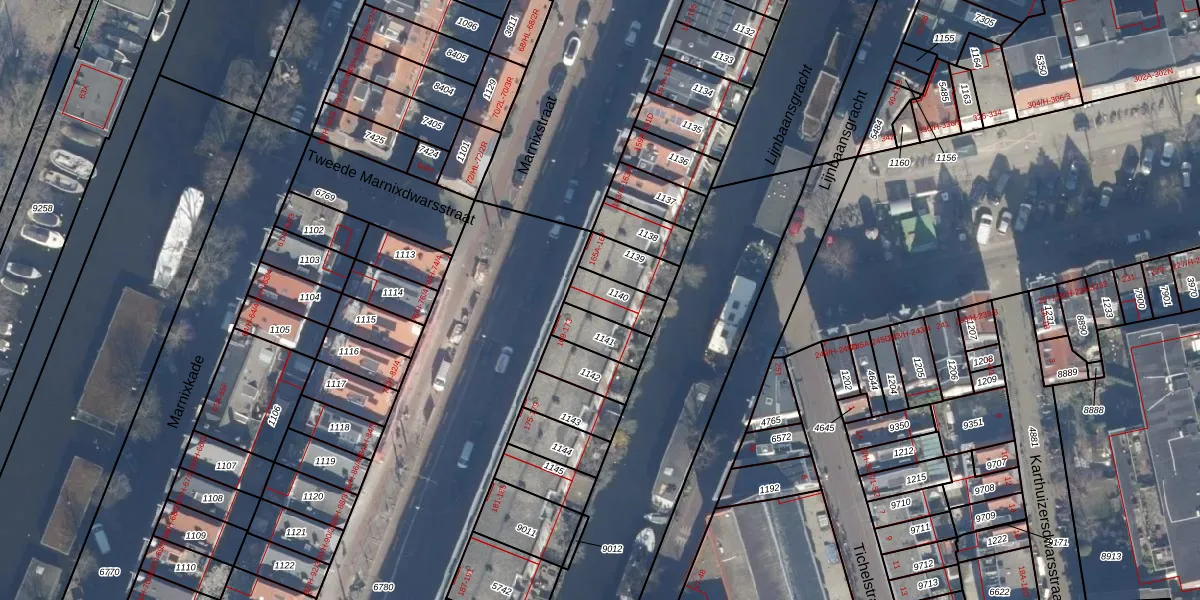Het perceel waarop Marnixstraat 169 staat heeft een oppervlakte van 102 m². Dit is een middelgroot perceel. De perceeloppervlakte wordt geregistreerd door het Kadaster. Gedetailleerde informatie over de maten van dit perceel kunt u vinden in het rapport Kadastrale kaart met maatvoering van Marnixstraat 169.