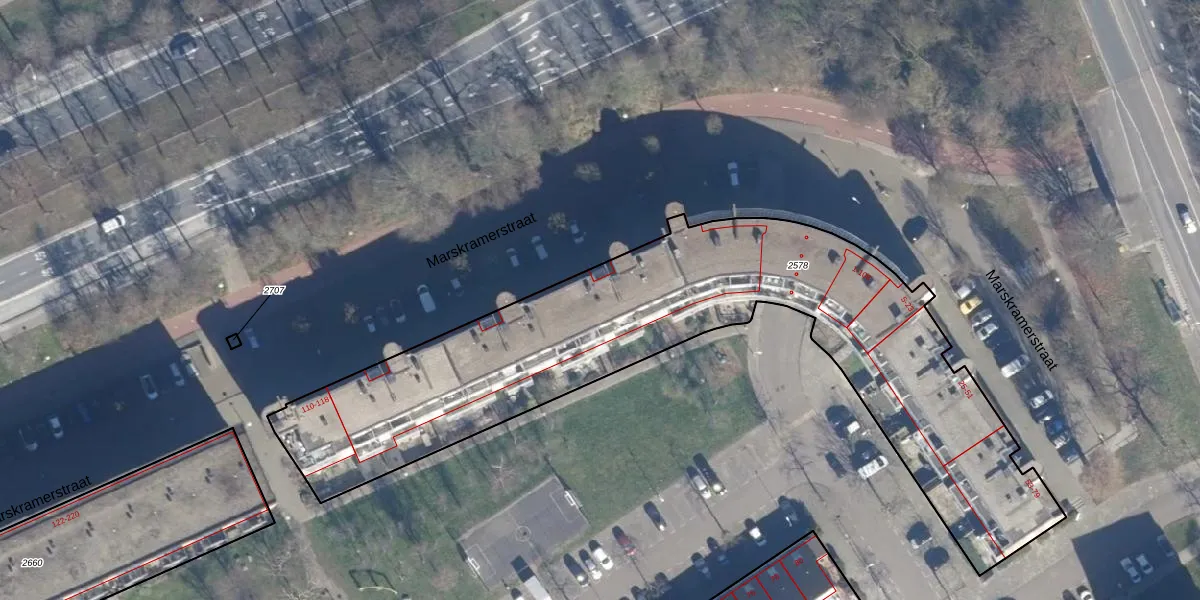 Het perceel waarop Marskramerstraat 32 staat heeft een oppervlakte van 2560 m². Dit is een zeer groot perceel. De perceeloppervlakte wordt geregistreerd door het Kadaster. Gedetailleerde informatie over de maten van dit perceel kunt u vinden in het rapport Kadastrale kaart met maatvoering van Marskramerstraat 32.