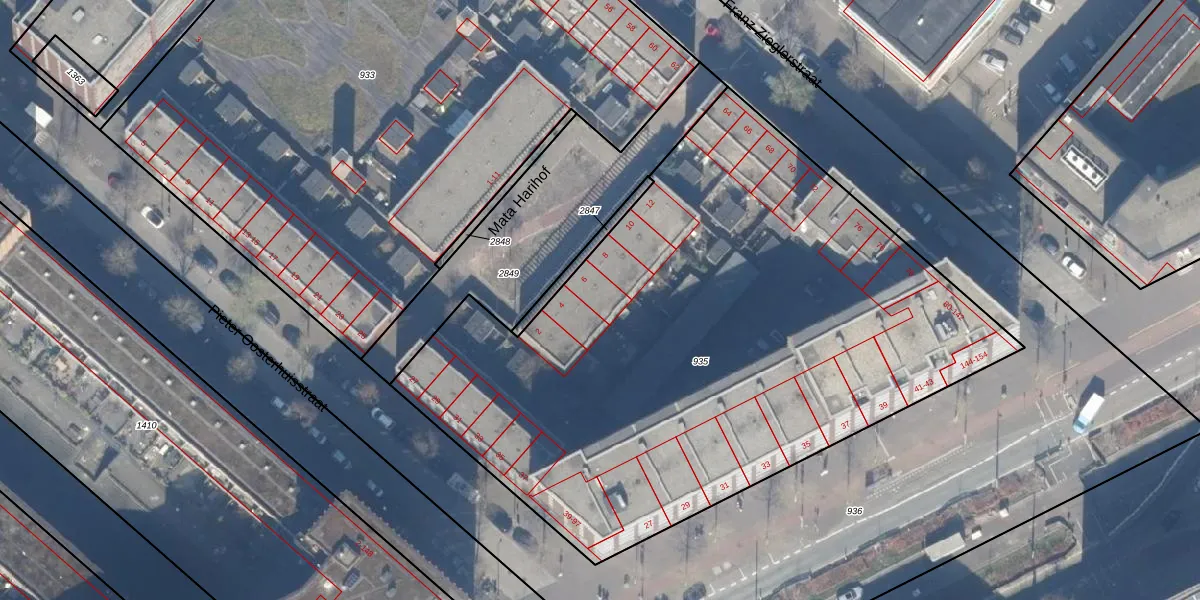 Mata Harihof 6 is gelegen op kadastraal perceel ASD41AU935. Deze kadastrale aanduiding is uniek en wordt gebruikt door het Kadaster om eigendomsrechten en andere zakelijke rechten vast te leggen. Het perceel maakt onderdeel uit van de kadastrale gemeente Amsterdam.