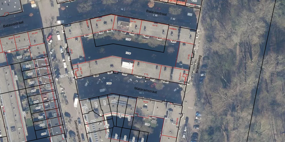 Het perceel waarop Mataramstraat 11-B staat heeft een oppervlakte van 2418 m². Dit is een zeer groot perceel. De perceeloppervlakte wordt geregistreerd door het Kadaster. Gedetailleerde informatie over de maten van dit perceel kunt u vinden in het rapport Kadastrale kaart met maatvoering van Mataramstraat 11-B.