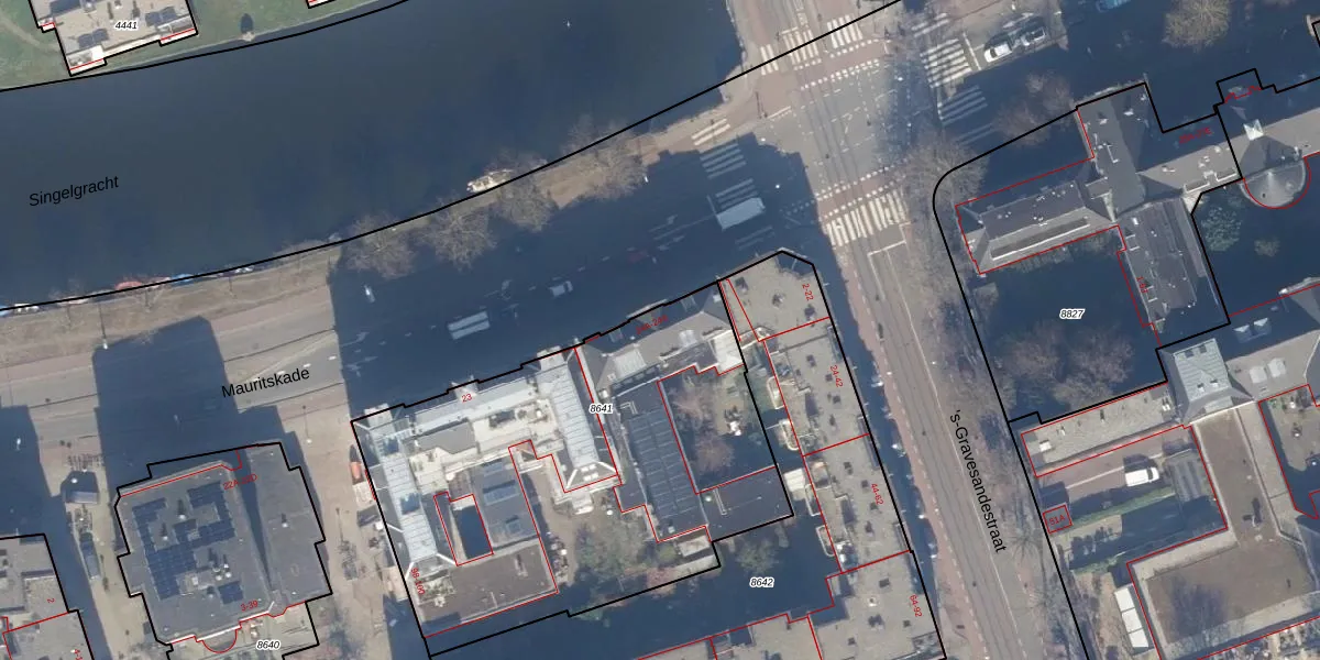 Het perceel waarop Mauritskade 24-B staat heeft een oppervlakte van 2226 m². Dit is een zeer groot perceel. De perceeloppervlakte wordt geregistreerd door het Kadaster. Gedetailleerde informatie over de maten van dit perceel kunt u vinden in het rapport Kadastrale kaart met maatvoering van Mauritskade 24-B.