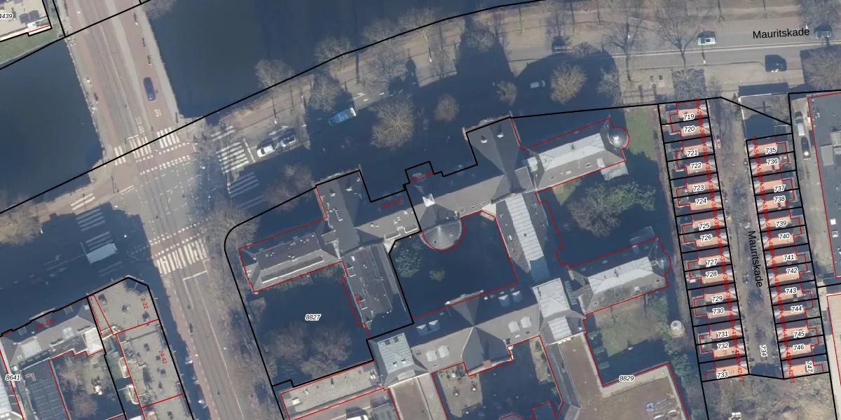Het perceel waarop Mauritskade 25-C staat heeft een oppervlakte van 8769 m². Dit is een zeer groot perceel. De perceeloppervlakte wordt geregistreerd door het Kadaster. Gedetailleerde informatie over de maten van dit perceel kunt u vinden in het rapport Kadastrale kaart met maatvoering van Mauritskade 25-C.