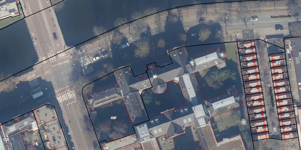 Het perceel waarop Mauritskade 27-E staat heeft een oppervlakte van 8769 m². Dit is een zeer groot perceel. De perceeloppervlakte wordt geregistreerd door het Kadaster. Gedetailleerde informatie over de maten van dit perceel kunt u vinden in het rapport Kadastrale kaart met maatvoering van Mauritskade 27-E.
