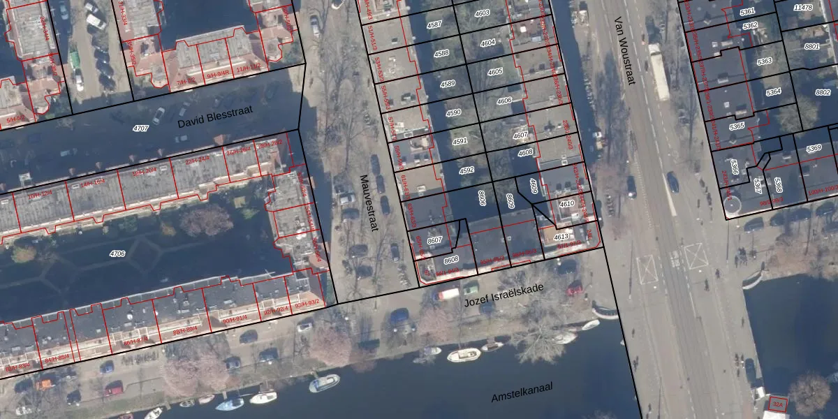 Het adres is gelegen op perceel 8606 in de sectie V en de kadastrale gemeente Amsterdam. De kadastrale aanduiding is aldus ASD18-V-8606. Het perceel is 266 m² groot. Dat is kleiner dan de gemiddelde perceeloppervlakte in Amsterdam, dat op 558,8 m² ligt. Het grootste perceel in de kadastrale gemeente is 12,5 ha. Het kleinste perceel heeft een oppervlakte van 0 m². Er zijn 8 adressen aanwezig op het perceel. In de Basisregistratie Kadaster (BRK) werden de grenzen van het perceel geregistreerd op 26-09-2006.