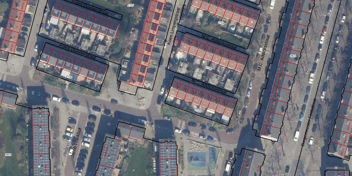 M.C. Addicksstraat 15 is gelegen op kadastraal perceel STN02D2731. Deze kadastrale aanduiding is uniek en wordt gebruikt door het Kadaster om eigendomsrechten en andere zakelijke rechten vast te leggen. Het perceel maakt onderdeel uit van de kadastrale gemeente Sloten Noord-Holland.