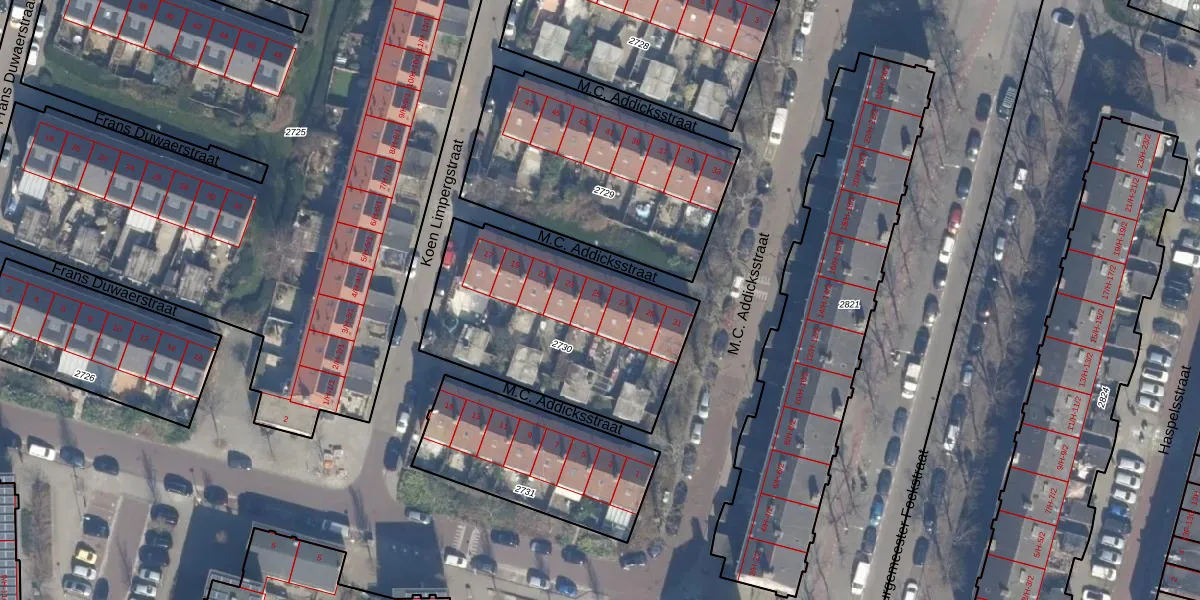 Het perceel waarop M.C. Addicksstraat 25 staat heeft een oppervlakte van 993 m². Dit is een groot perceel. De perceeloppervlakte wordt geregistreerd door het Kadaster. Gedetailleerde informatie over de maten van dit perceel kunt u vinden in het rapport Kadastrale kaart met maatvoering van M.C. Addicksstraat 25.