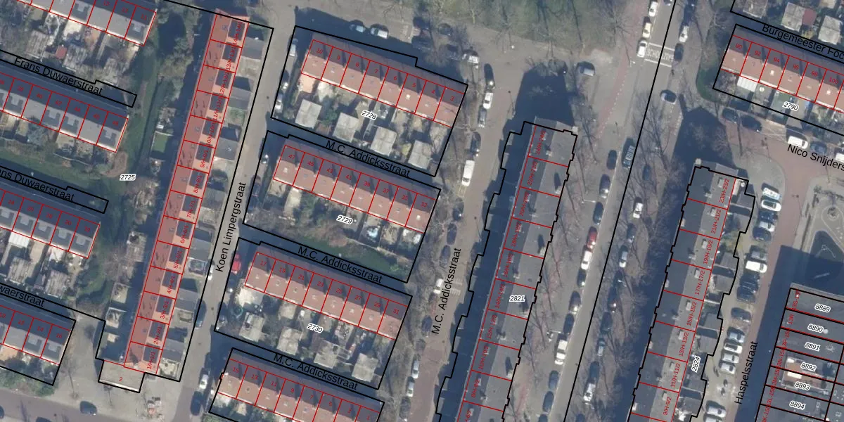 Het perceel waarop M.C. Addicksstraat 33 staat heeft een oppervlakte van 992 m². Dit is een groot perceel. De perceeloppervlakte wordt geregistreerd door het Kadaster. Gedetailleerde informatie over de maten van dit perceel kunt u vinden in het rapport Kadastrale kaart met maatvoering van M.C. Addicksstraat 33.