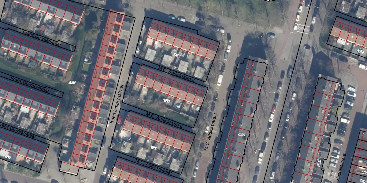 Het perceel waarop M.C. Addicksstraat 37 staat heeft een oppervlakte van 992 m². Dit is een groot perceel. De perceeloppervlakte wordt geregistreerd door het Kadaster. Gedetailleerde informatie over de maten van dit perceel kunt u vinden in het rapport Kadastrale kaart met maatvoering van M.C. Addicksstraat 37.