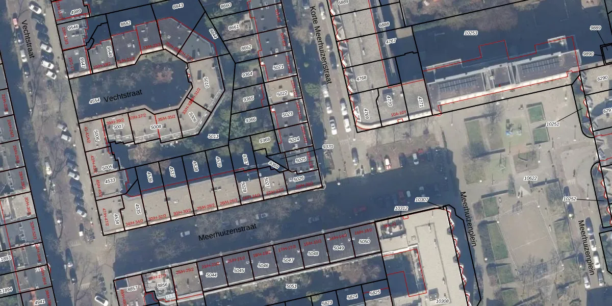 Meerhuizenplein 12-H is gelegen op kadastraal perceel ASD18V5025. Deze kadastrale aanduiding is uniek en wordt gebruikt door het Kadaster om eigendomsrechten en andere zakelijke rechten vast te leggen. Het perceel maakt onderdeel uit van de kadastrale gemeente Amsterdam.