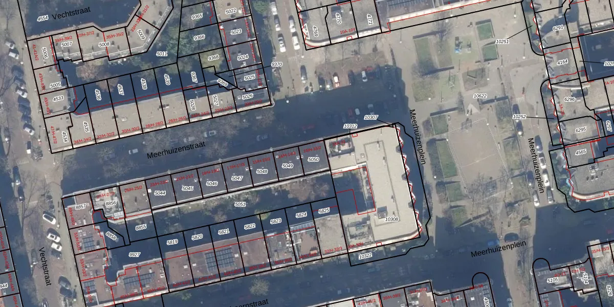 Meerhuizenplein 16-H is gelegen op kadastraal perceel ASD18V5050. Deze kadastrale aanduiding is uniek en wordt gebruikt door het Kadaster om eigendomsrechten en andere zakelijke rechten vast te leggen. Het perceel maakt onderdeel uit van de kadastrale gemeente Amsterdam.