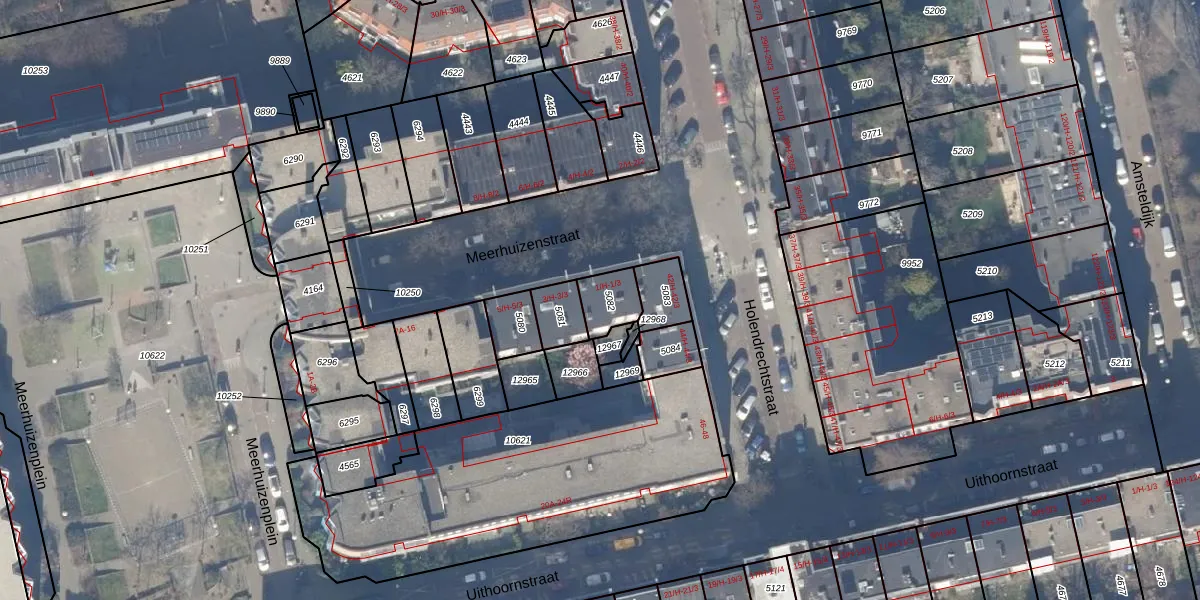 Meerhuizenstraat 1-3 is gelegen op kadastraal perceel ASD18V5082. Deze kadastrale aanduiding is uniek en wordt gebruikt door het Kadaster om eigendomsrechten en andere zakelijke rechten vast te leggen. Het perceel maakt onderdeel uit van de kadastrale gemeente Amsterdam.