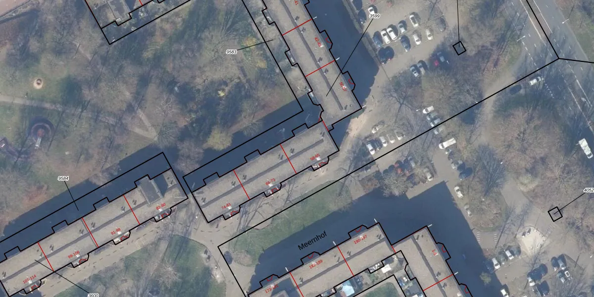 Het perceel waarop Meernhof 63 staat heeft een oppervlakte van 2200 m². Dit is een zeer groot perceel. De perceeloppervlakte wordt geregistreerd door het Kadaster. Gedetailleerde informatie over de maten van dit perceel kunt u vinden in het rapport Kadastrale kaart met maatvoering van Meernhof 63.