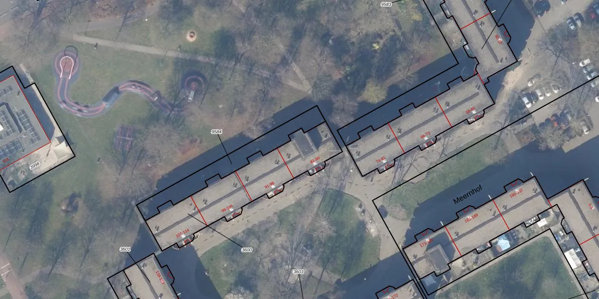 Het perceel waarop Meernhof 86 staat heeft een oppervlakte van 885 m². Dit is een groot perceel. De perceeloppervlakte wordt geregistreerd door het Kadaster. Gedetailleerde informatie over de maten van dit perceel kunt u vinden in het rapport Kadastrale kaart met maatvoering van Meernhof 86.