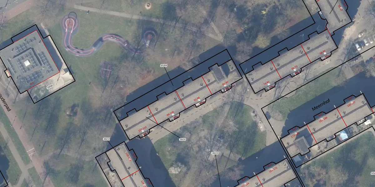 Het perceel waarop Meernhof 95 staat heeft een oppervlakte van 885 m². Dit is een groot perceel. De perceeloppervlakte wordt geregistreerd door het Kadaster. Gedetailleerde informatie over de maten van dit perceel kunt u vinden in het rapport Kadastrale kaart met maatvoering van Meernhof 95.