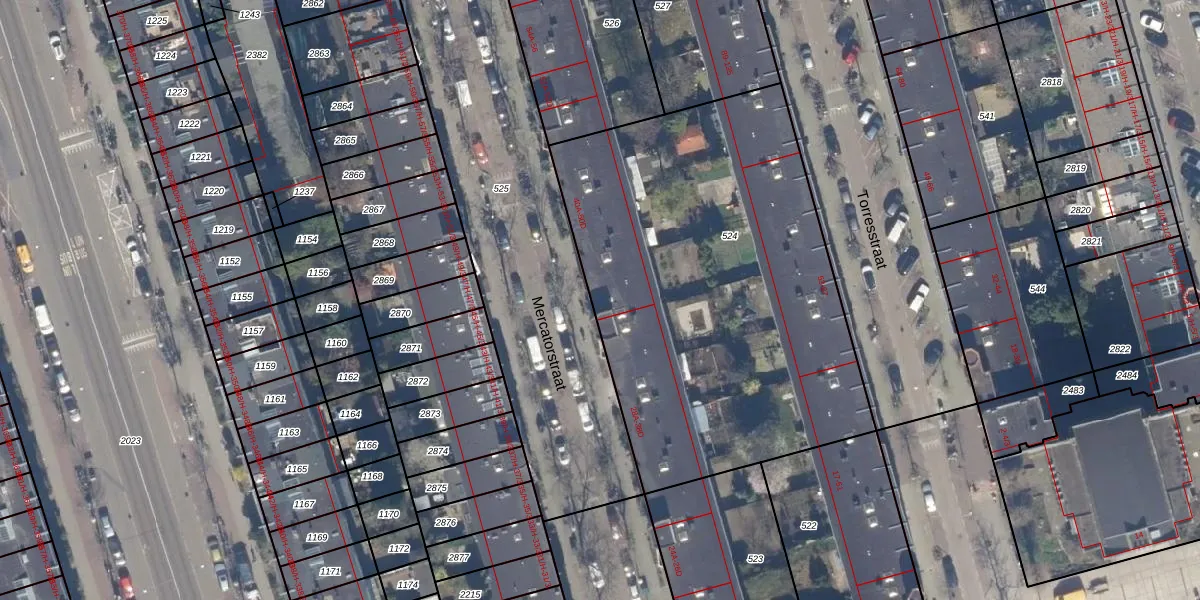 Het perceel waarop Mercatorstraat 40-B staat heeft een oppervlakte van 2400 m². Dit is een zeer groot perceel. De perceeloppervlakte wordt geregistreerd door het Kadaster. Gedetailleerde informatie over de maten van dit perceel kunt u vinden in het rapport Kadastrale kaart met maatvoering van Mercatorstraat 40-B.
