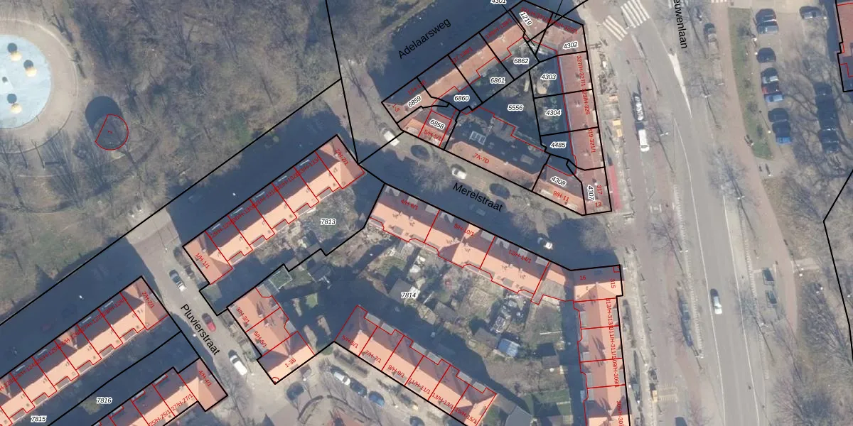 Het perceel waarop Merelstraat 6-1 staat heeft een oppervlakte van 4185 m². Dit is een zeer groot perceel. De perceeloppervlakte wordt geregistreerd door het Kadaster. Gedetailleerde informatie over de maten van dit perceel kunt u vinden in het rapport Kadastrale kaart met maatvoering van Merelstraat 6-1.