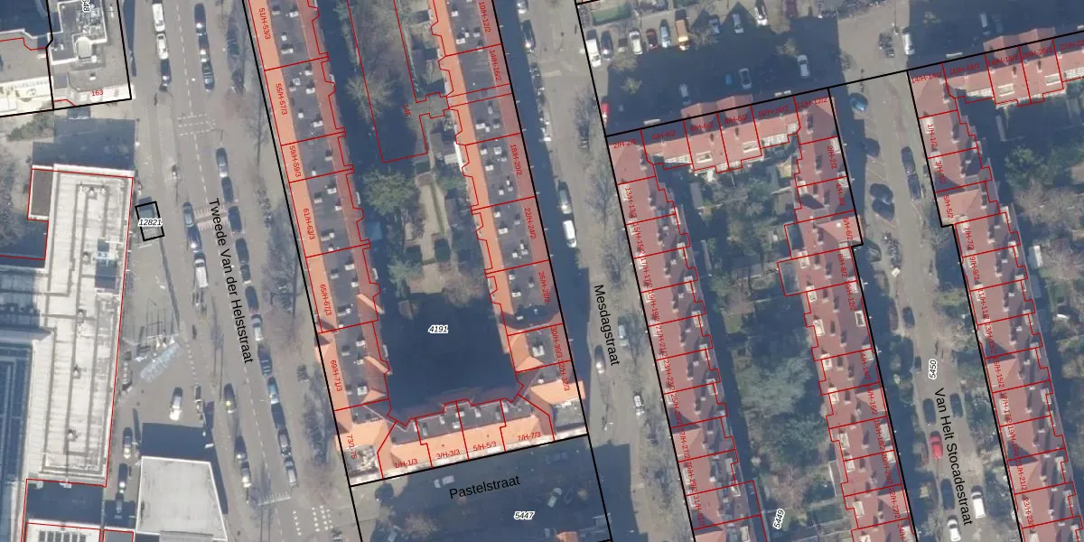 Het adres is gelegen op perceel 4191 in de sectie V en de kadastrale gemeente Amsterdam. De kadastrale aanduiding is aldus ASD18-V-4191. De oppervlakte van het perceel is 5440 m². Dat is groter dan gemiddeld in Amsterdam, waar de gemiddelde perceeloppervlakte op 559,23 m² ligt. De grootste perceeloppervlakte in de kadastrale gemeente is 12,5 ha. De kleinste oppervlakte bedraagt 0 m². Er zijn 145 adressen aanwezig op het perceel. De huidige grenzen van het perceel zijn digitaal in de Basisregistratie Kadaster (BRK) geregistreerd op 09-08-2006.